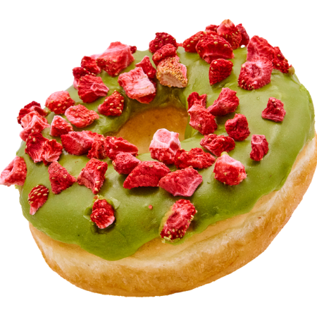 A little earthy, a little fruity, very cute. This soft ring donut is glazed in vibrant matcha and finished with freeze-dried strawberries.