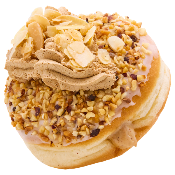 Nussig auf die beste Art. Dieser Monthly Special Donut ist mit Mandel-Pudding gefüllt, mit Vanilleglasur überzogen, in gerösteten Haselnüssen gewälzt und mit einem großzügigen Swirl aus Haselnuss-Sahne sowie karamellisierten Mandeln getoppt.
