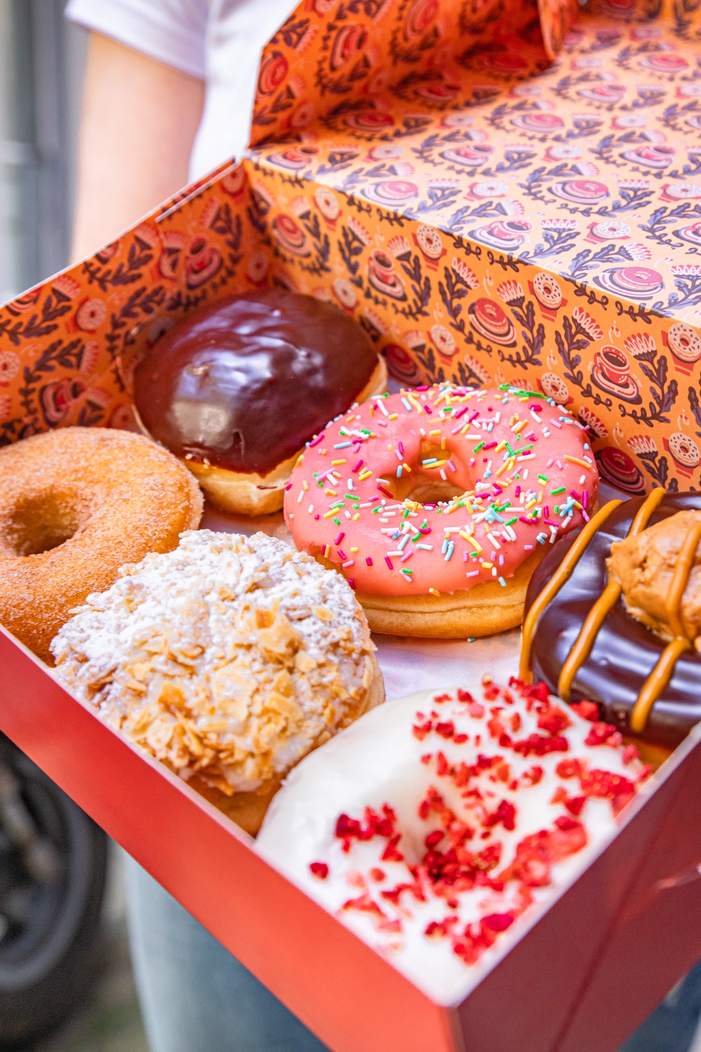 We reworked our branding during the pandemic and ordered new takeaway boxes, which turned out to be a blessing and a curse. Our pink boxes are so distinct you can see them from miles away. Unfortunately, you also see them pollute the streets of Berlin. We wanted to offer a reusable option, but none of the reuse systems worked for our product, which is why, in 2022, we developed our own reusable boxes people can get their donuts in if they pay a deposit.