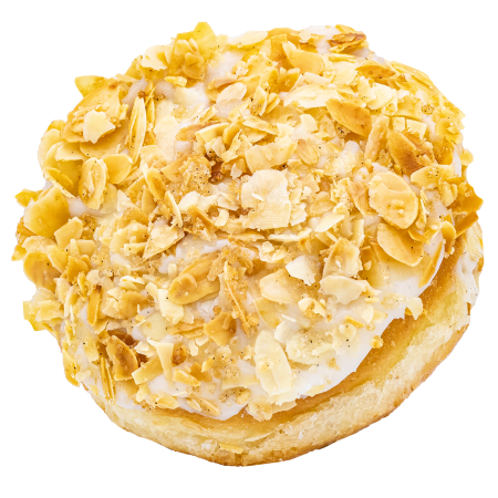 You don’t know Bienenstich yet? Well, ask any German around you and we promise they will start raving about it. This donut is filled with our homemade vanilla custard made with organic vanilla, then dunked in a vanilla glaze, and topped with roasted slivered almonds.