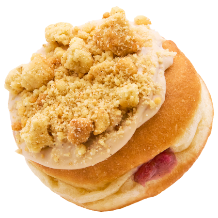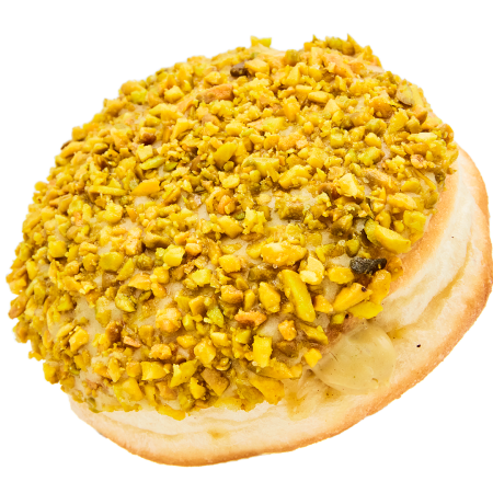 This donut is inspired by our customer Emi, who suggested this delightful flavour during our customer flavour contest. It’s filled with delicious pistachio cream, covered with vanilla glaze, and topped with salted roasted pistachios for the perfect crunch.