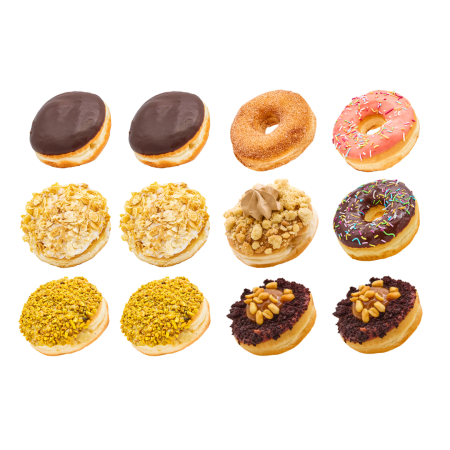 This box is perfect for everyone who want a selection of flavours for a bigger party and don’t want to choose. It contains our all-time favourites: 2x Boston Cream, 2x Bienenstich, 2x Brownie Caramel Peanut, 2x Pistachio Dream, 1x Apple Caramel, 1x Strawberry Sprinkles, 1x Cinnamon Sugar, and 1x Choc Sprinkles